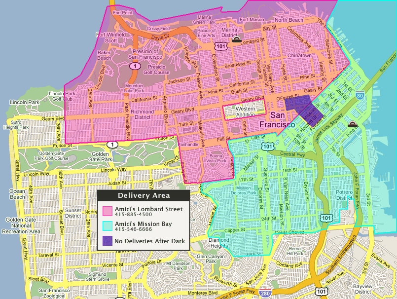 So well known are these areas that pizza delivery services won’t visit them. Witness SF Eater’s article on Amici’s delivery map: