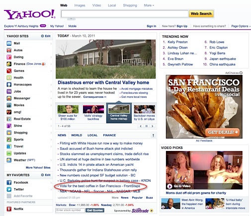 Should you feel our little “Best Coffee (House) In San Francisco” competition isn’t getting any attention, think about this, theFrontSteps is on the front page “Headlines” of Yahoo!. You can add a few thousand extra eyeballs to the mix.