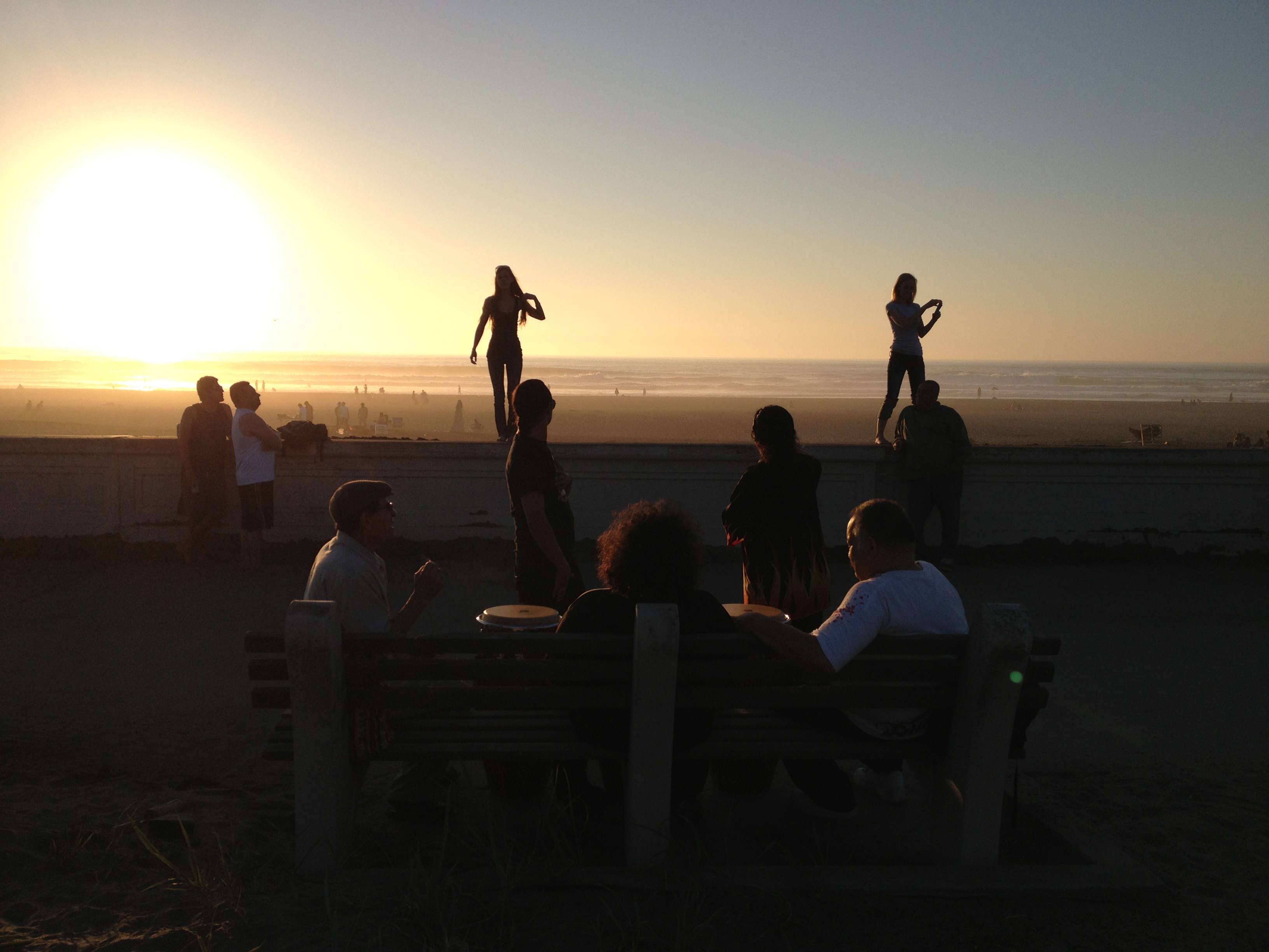 I snapped this while I was sitting on the trunk of my car having just changed out of my wetsuit on Tuesday afternoon/evening down at Ocean Beach. What is so great is that the crew in the foreground was straight out of a movie. They rolled up in a beat up van with the fan on the dashboard, foam dice hanging from the rear view mirror, and smoke (of the cannabis kind) spilling from the van. They staggered out (check out the one dude’s frizzy fro), hauled their bongo drums to the bench, and set up shop. Cerveza Modelo was flowing, the one guy with the flame shirt claims to have been in Santana (the band), drums were being played, Espanish and Spanglish (say that with a South American accent) was being spoken, girls were being whistled at, and “Viva Fidel Castro” was being shouted loud after every song. The tunes they played were very Cubana and they engaged every person around. They got two girls to join in and share in the dance (and smoke), and their their universe seemed complete. The sun was setting, the waves were pumping, and the music was loud…so my universe was rotating perfectly too.