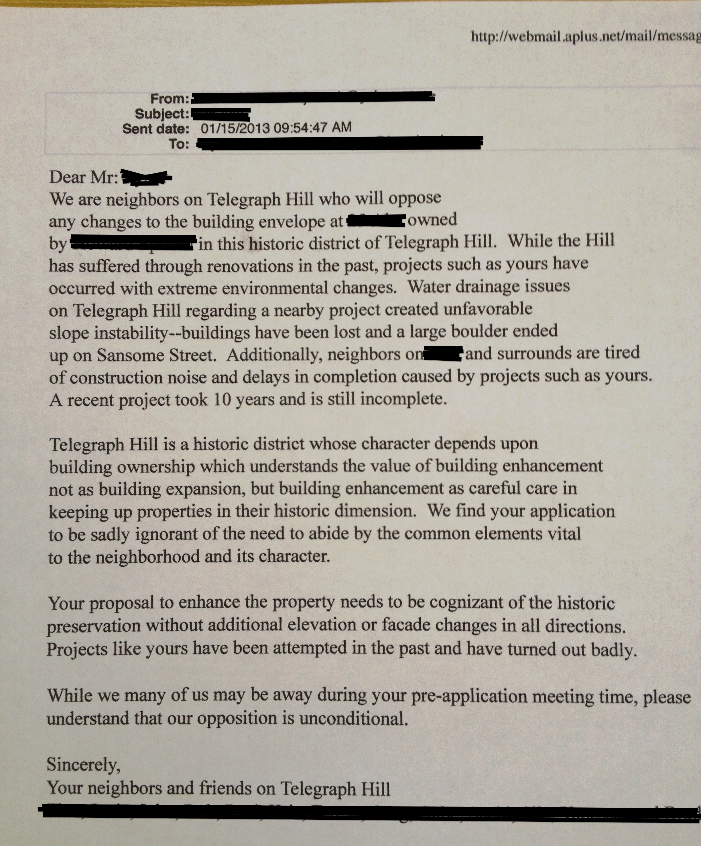 Ahhh….neighbors. You love ’em. You hate ’em. You can’t live in San Francisco without ’em, and you certainly can’t easily remodel a home to today’s standards without opposition from them. Check out what just hit our inbox: