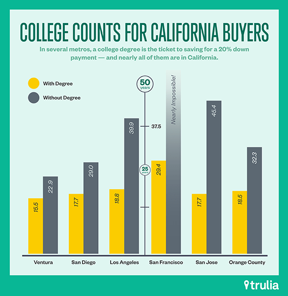 To go to college, or not? This is one question many millennials ask themselves. For households between 25 – 30 years of age who want to live in California’s major metros the answer is GO! A recent Trulia study found, it takes almost 20 years for degreed millennials to save the 20% down payment in San Jose, Los Angeles, Orange County and San Diego. For millennials without a degree, they need to save for decades. In San Jose, the amount of time is 45 years.