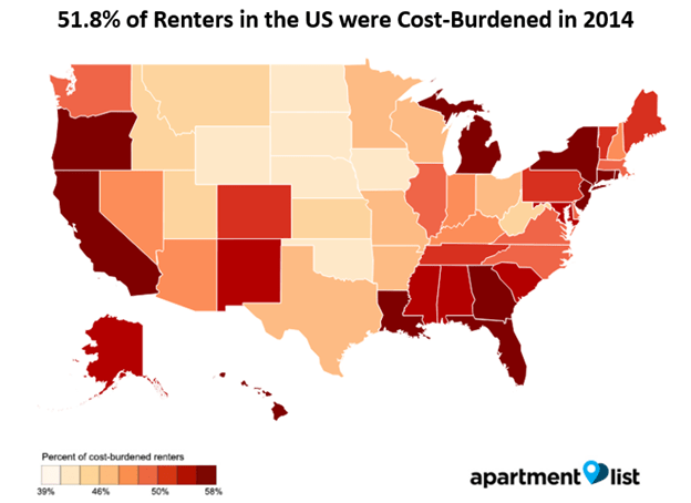 Apartment List recently analyzed Census data from 2007-2014, to see which cities and states have the most cost-burdened renters (those spending more than 30% of their income on rent). Nationwide, 52% of renters are cost-burdened, up from 24% in 1960 and 38% in 2000, but the numbers vary depending on city and state.