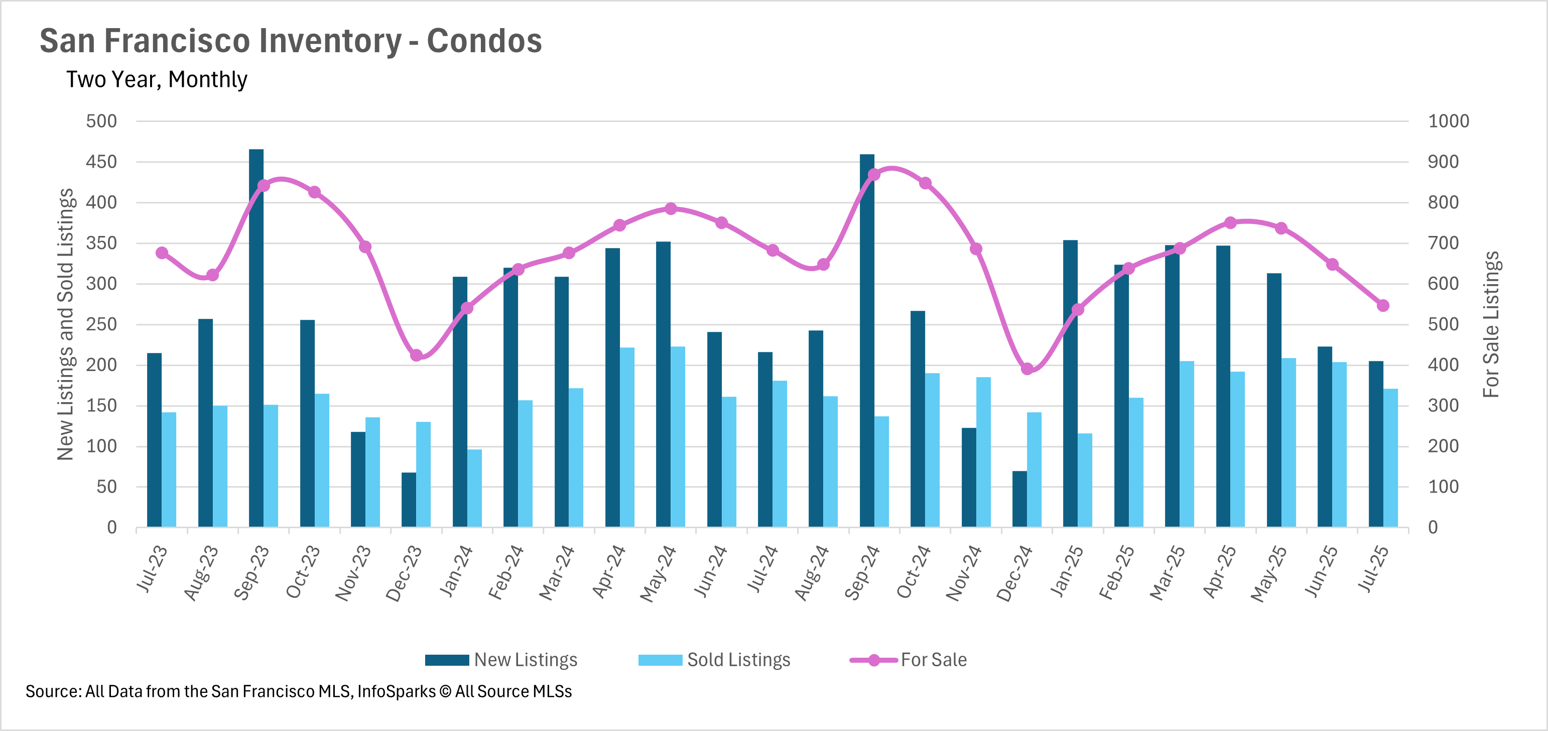 While much of the Bay Area is experiencing inventory issues, the vast majority of areas are seeing inventories begin to pile up. As we know, San Francisco has the opposite problem; the area can’t seem to keep enough inventory on the market. This trend has continued in July, with 15.93% less single-family inventory on a year-over-year basis and 19.91% less condo inventory. This is largely due to the fact that fewer new listings are hitting the market each month. On a year-over-year basis, the single-family home market saw 18.46% fewer new listings in July, and the condo market saw 5.09% fewer new listings.
