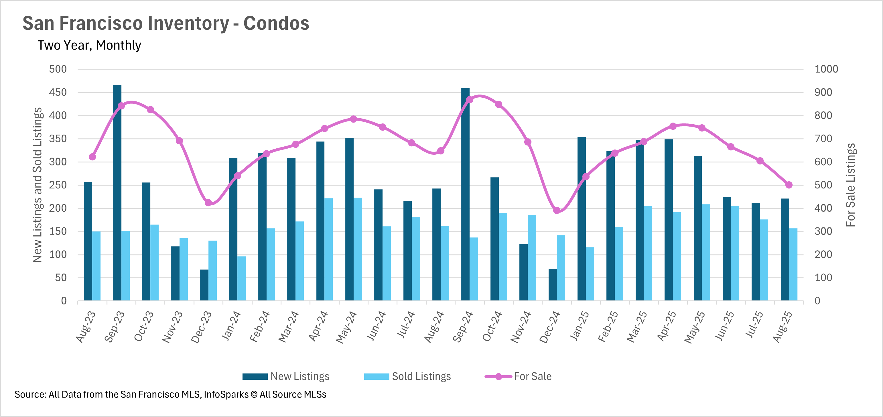 The inventory problem is nothing new in San Francisco. While many other counties saw ballooning inventories throughout the spring and early summer, inventories in San Francisco continued their decline. This trend continued in August, with the single-family home market recording 17.51% fewer active listings on a year-over-year basis, and the condo market recording 22.69% fewer active listings. This trend continues to be concerning, but unfortunately, there’s no end in sight!
